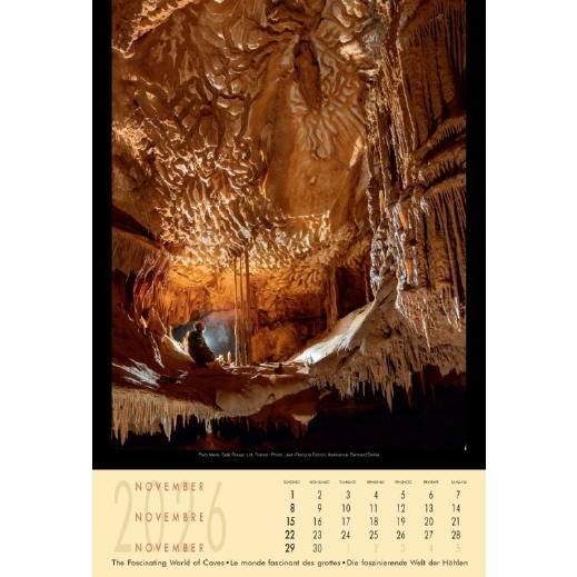 Speleo Projects features a selection of wild and touristic caves from around the world. The 12 monthly pages provide a glimpse into the caves of China, Brazil, France, Hungary, Laos, Turkmenistan, United Kingdom, United States.